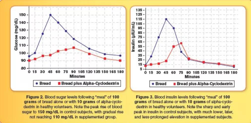 研究發(fā)現(xiàn),在飯前服用一定量的α-環(huán)糊精,能顯著降低碳水化合物膳食的血糖反應,增加胰島素。