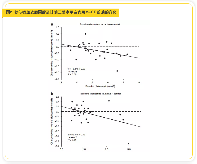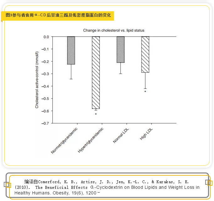 這項(xiàng)研究結(jié)果顯示與對照組相比,試驗(yàn)組人群每天食用6gα-CD,一個(gè)月后體重平均降低0.4公斤,血清總膽固醇水平降低5.3%,低密度脂蛋白水平降低6.7%,載脂蛋白B濃度降低了5.6%。雖然兩組的空腹血糖沒有明顯變化,但胰島素水平下降了9.5%,提示胰島素敏感性增加(見表1,圖1)。研究還發(fā)現(xiàn),志愿者試驗(yàn)前血液膽固醇水平越高,食用α-CD期間膽固醇降低效果越好,同樣,試驗(yàn)前甘油三酯水平越高的人, 補(bǔ)充α-CD期間降低的效果也越好(見圖2)。試驗(yàn)前血液甘油三酯水平均大于2.26 mmol/L的參與者,在食用1個(gè)月的α-CD后膽固醇水平降低了11.1%。而試驗(yàn)前血液甘油三酯水平均低于1.69mmol/L的參與者,α-CD干預(yù)后膽固醇水平僅降低了4.3%,無顯著性差異(見圖3)。這些發(fā)現(xiàn)表明,相對于血脂正常的人,高血脂患者補(bǔ)充α-CD后的改善效果要更明顯。